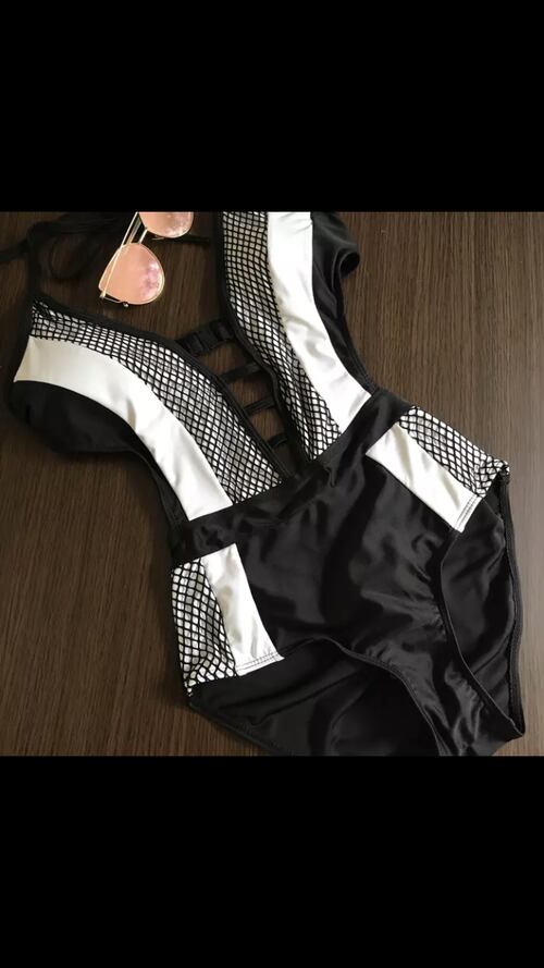 モノトーンにセクシーなフィッシュネット メッシュ がレイヤードされたワンピース水着 モノキニです。