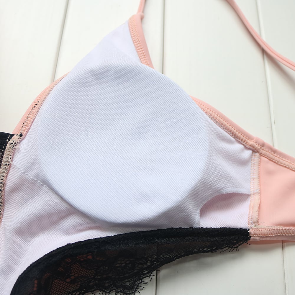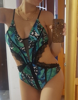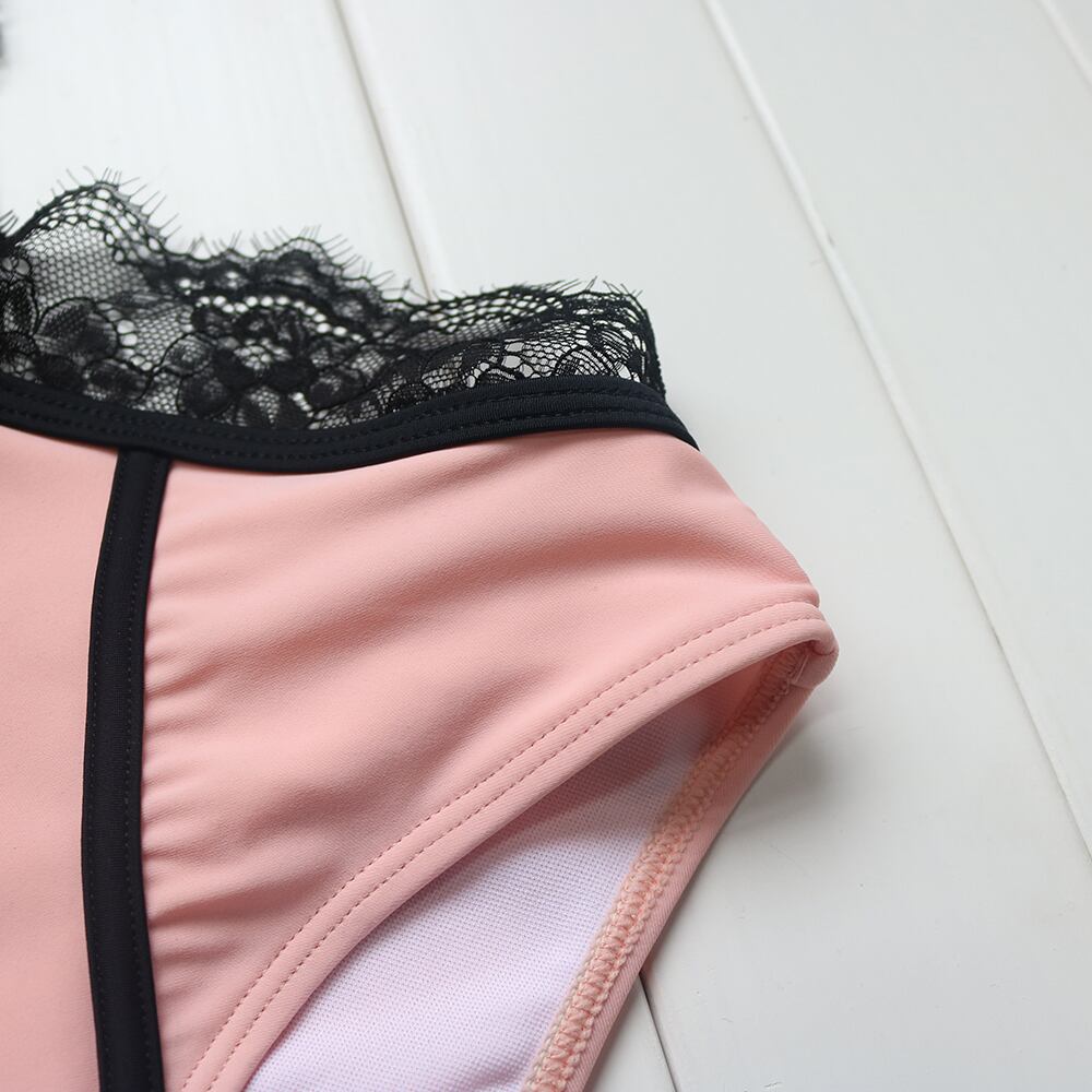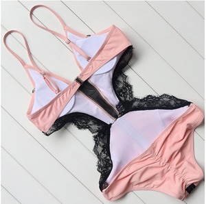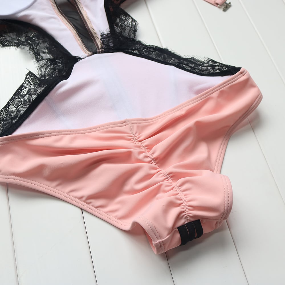 トレンドカラーの柔らかなピンク、エレガントなロイヤルブルー、セクシーワイルドなリーフ柄3パターンご用意いたしました。今季大流行のワンピース水着 モノキニ。 胸元のメッシュとレースがゴージャスでセクシー!