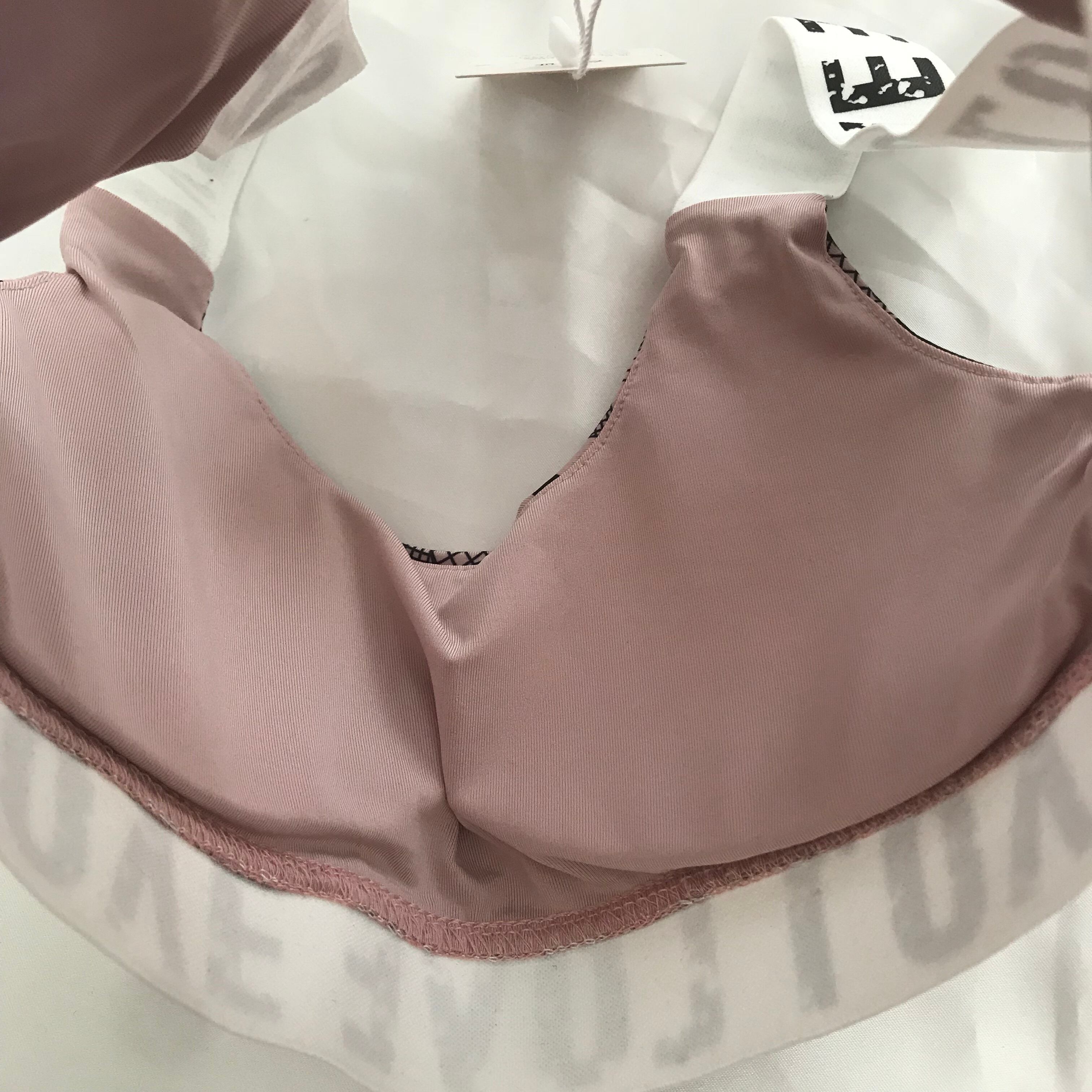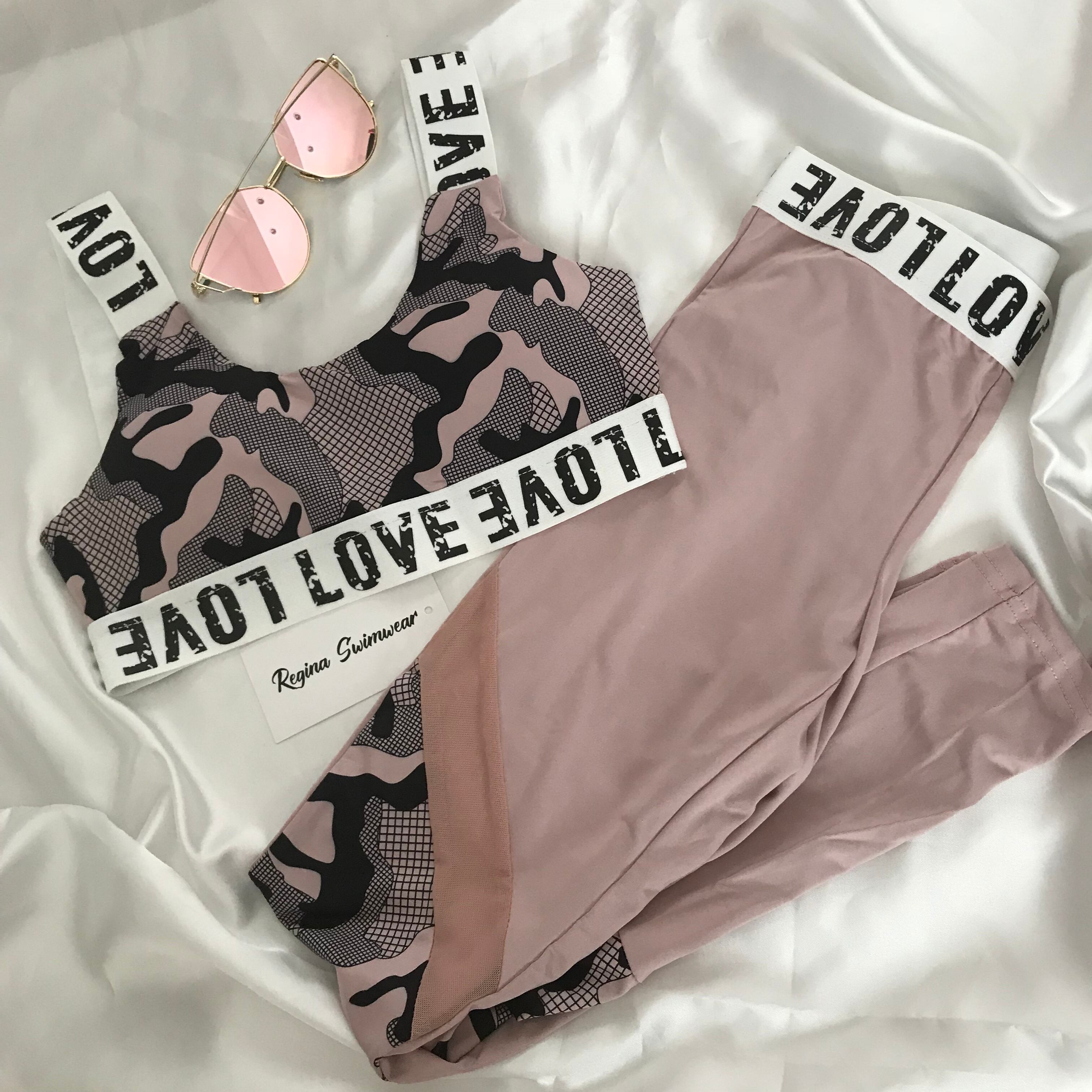 スモーキーピンクxカモフラ柄がセクシーでキュートなエクササイズウェア上下セット。