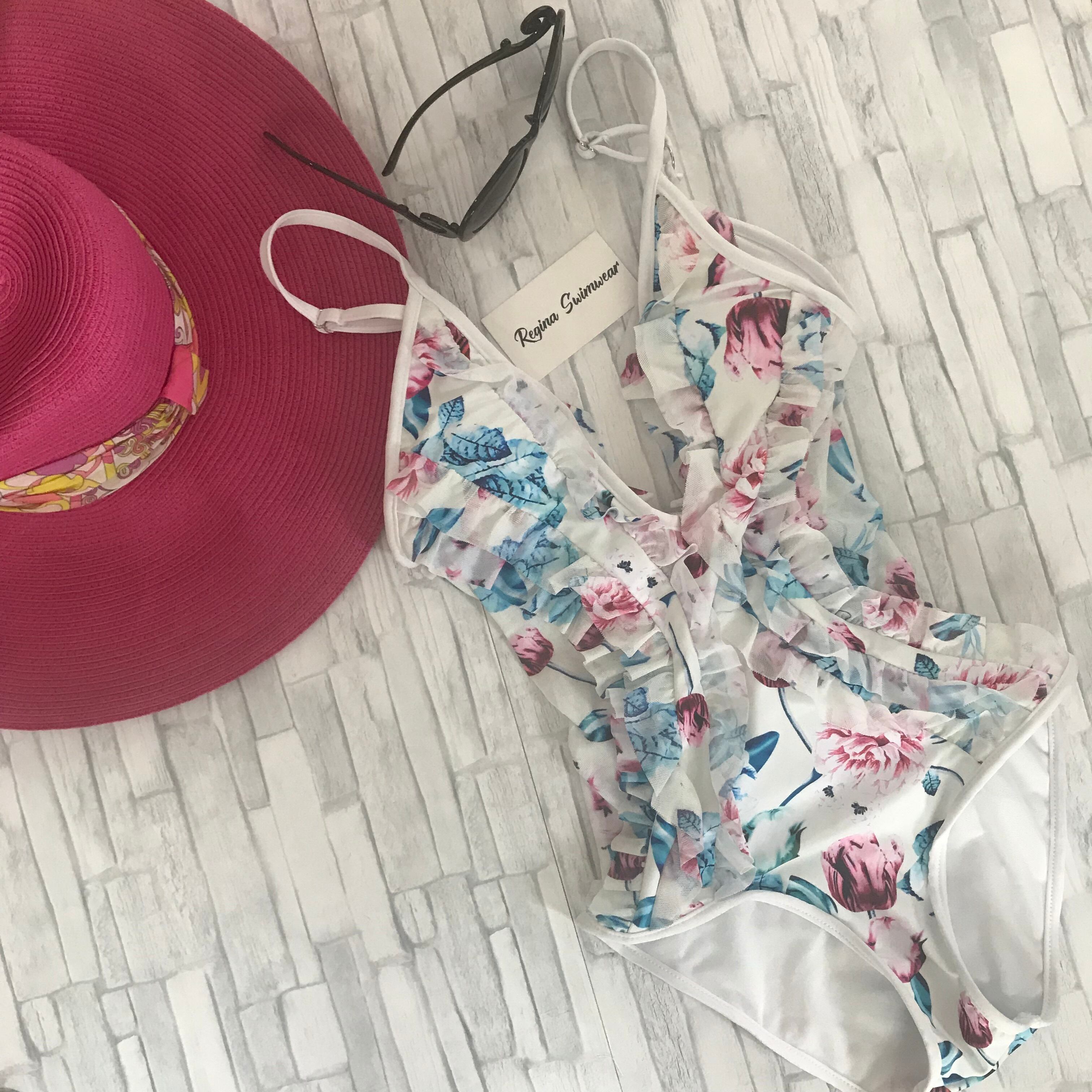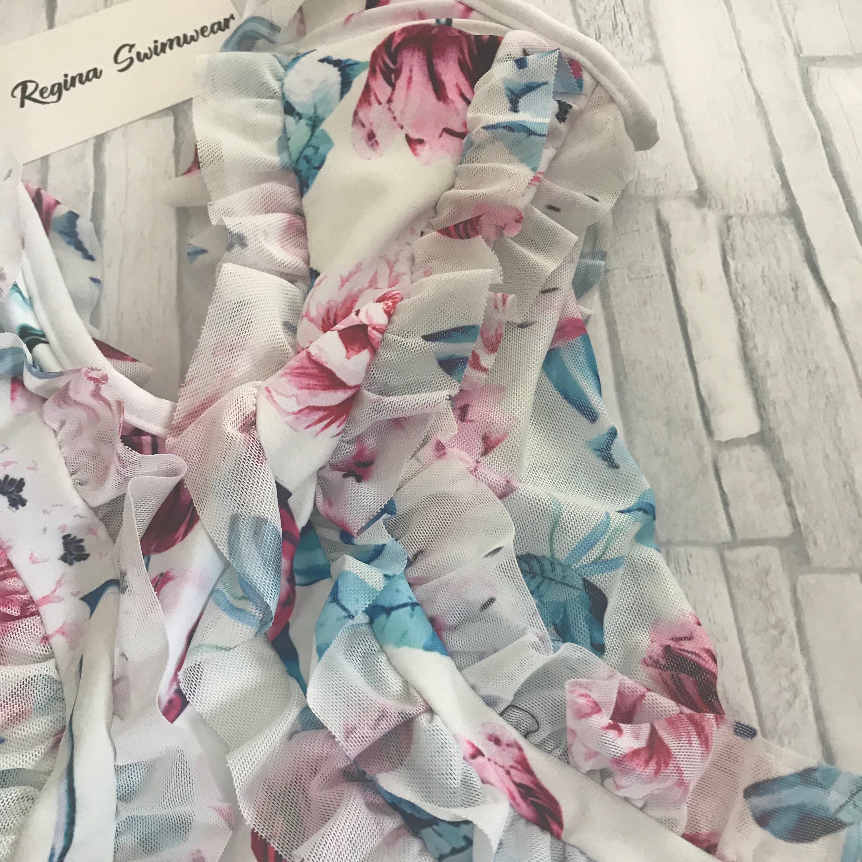 透きとおるようなクールなカラーコンビネーションにフリルが前面についたフェアリーテイストなドレス水着。色白肌にも似合う上品でエレガントな一着です。